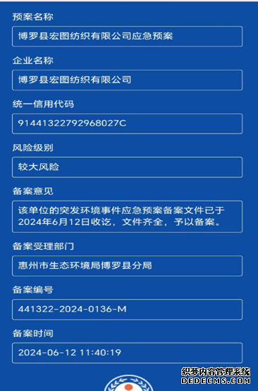 | 突發(fā)環(huán)境事件應(yīng)急預(yù)案 | 已制訂《博羅縣宏圖紡織有限公司突發(fā)環(huán)境事件應(yīng)急預(yù)案》,并于2024年 6月12日在惠州市生態(tài)環(huán)境局博羅分局備案,備案編號(hào):441322-2024-0136-M |