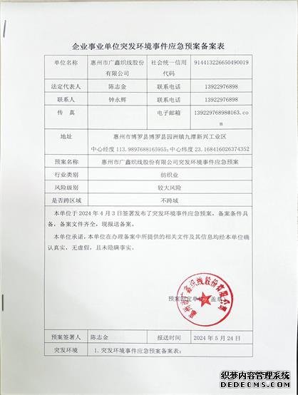 已制訂《惠州市廣鑫織線股份有限公司突發(fā)環(huán)境事件應(yīng)急預(yù)案》,并于2024年05月27日在惠州市生態(tài)環(huán)境局博羅分局備案,