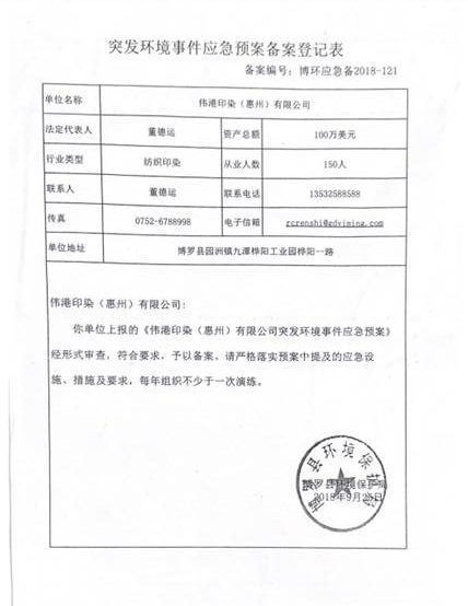 附件:《偉港印染(惠州)有限公司突發(fā)環(huán)境事件應(yīng)急預(yù)案備案登記表》 |