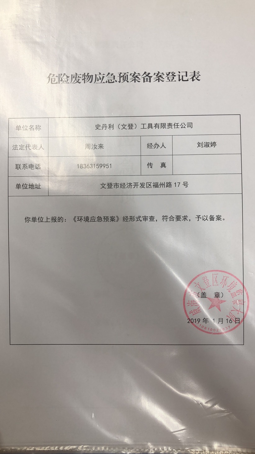 已制訂《危險(xiǎn)廢物環(huán)境應(yīng)急預(yù)案》,并于2019年1月 在威海市文登區(qū)環(huán)境監(jiān)察大隊(duì)備案, 附件鏈接: 《史丹利(文登)工具有限責(zé)任公司環(huán)境應(yīng)急預(yù)案2020》 |